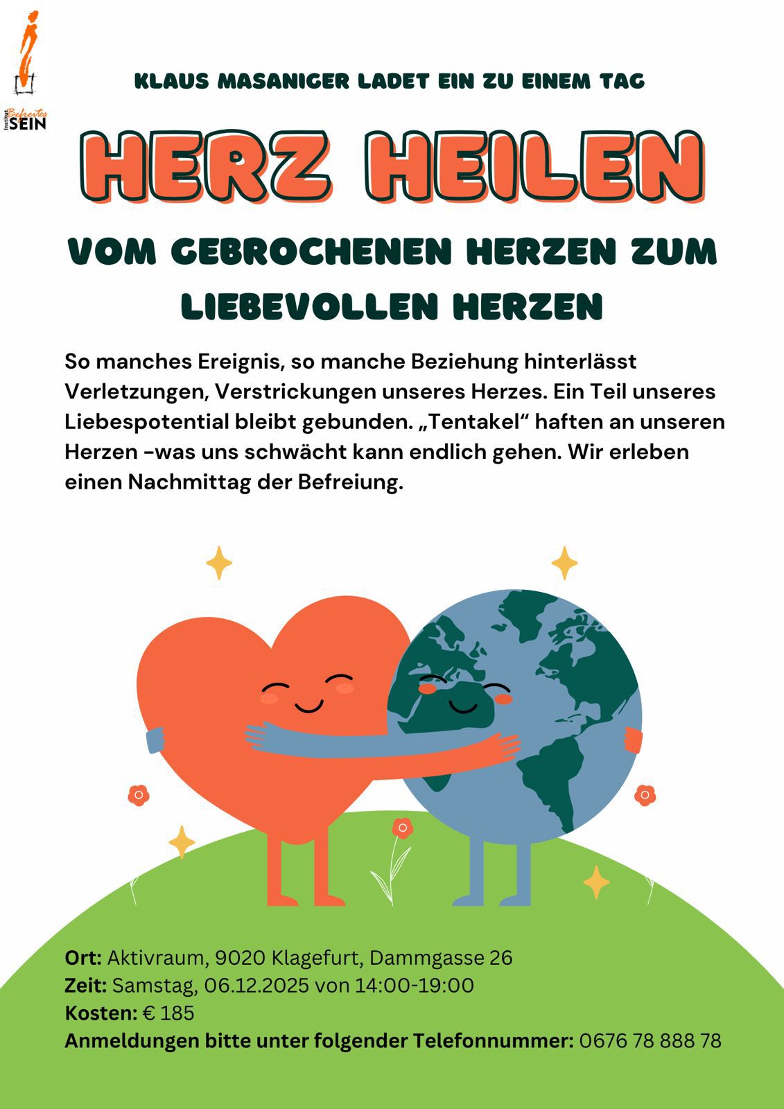 24 Mai @ 14:00 - 19:00 Herz heilen Aktivraum Dammgasse 26, Klagenfurt, Austria vom gebrochen Herzen zum liebevollen Herzen €185